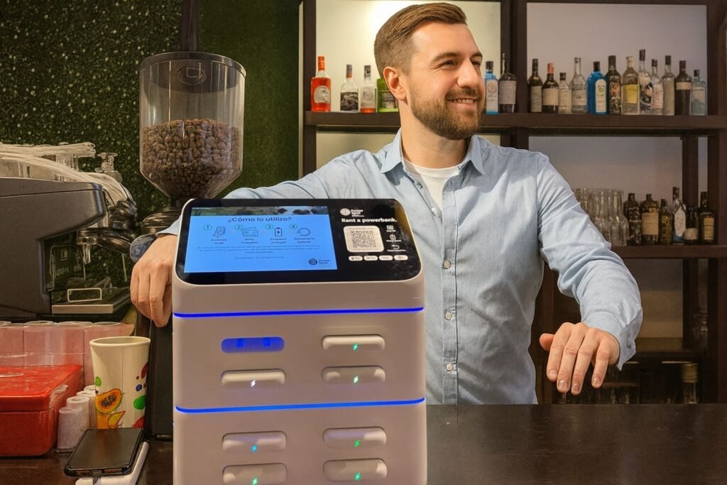 Customers simply scan the QR code, grab a powerbank, and start charging immediately.